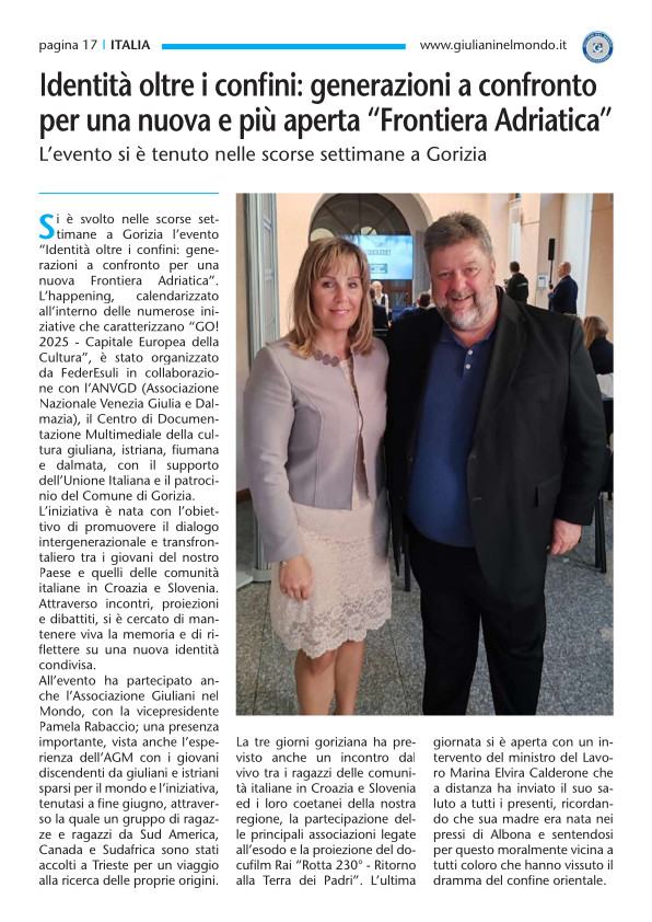 Si è tenuto a Gorizia l’evento “Identità oltre i confini: generazioni a confronto per una nuova Frontiera Adriatica”. L’iniziativa, parte del programma di “GO! 2025 Capitale Europea della Cultura”, è stata organizzata da FederEsuli in collaborazione con l’ANVGD, il Centro di Documentazione Multimediale della cultura giuliana, istriana, fiumana e dalmata, con il supporto dell’Unione Italiana e il patrocinio del Comune di Gorizia.